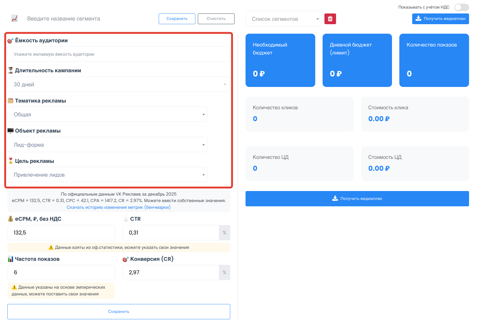 На основе бенчмарков от VK работает инструмент «Медиапланирование» в E2. Мы регулярно обновляем данные, чтобы вы получали точные прогнозы.