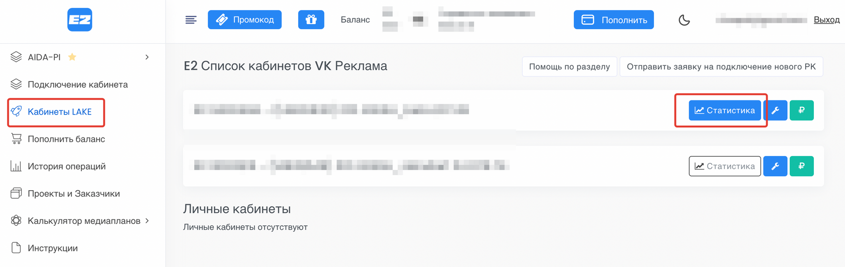 - После того, как добавили кабинет в подходящий проект, вы сможете быстро переходить в «Статистику» из раздела «Кабинеты LAKE», нажав напротив кабинета на иконку с графиком