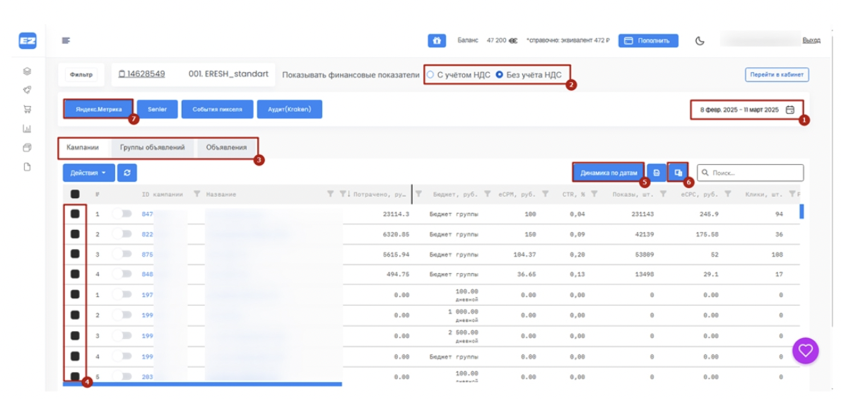 — настраивать отчёты по различным параметрам, в том числе с динамикой по датам, конверсиям, затратам с НДС;