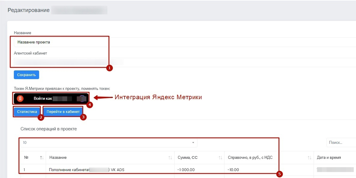 - Здесь можно изменить название выбранного проекта и кабинет (1), подключить интеграцию Яндекс Метрики (4)