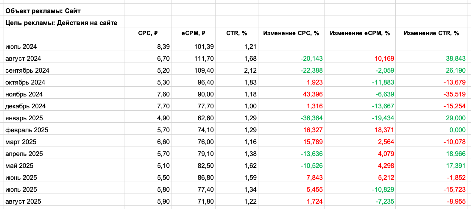 Для наглядности обозначили изменения цветовой маркировкой: Зеленый — положительная динамика: снижение CPC и eCPM (стоимость клика и тысячи показов), рост CTR (кликабельность) Красный — отрицательная динамика: увеличение CPC и eCPM, снижение CTR