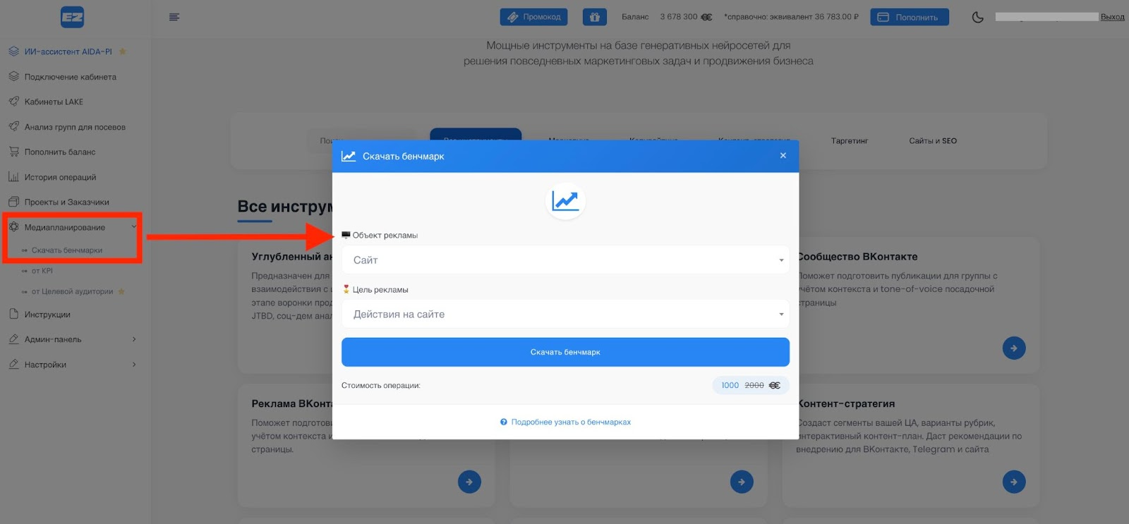 — На панели слева находим инструмент «Калькулятор медиапланов» — Выбираем вкладку «Скачать бенчмарки» — Указываем нужный объект рекламы и цель (в нашем случае — Сайт) — Указываем цель рекламы (в нашем случае — Действия на сайте) — Нажимаем «Скачать бенчмарк»
