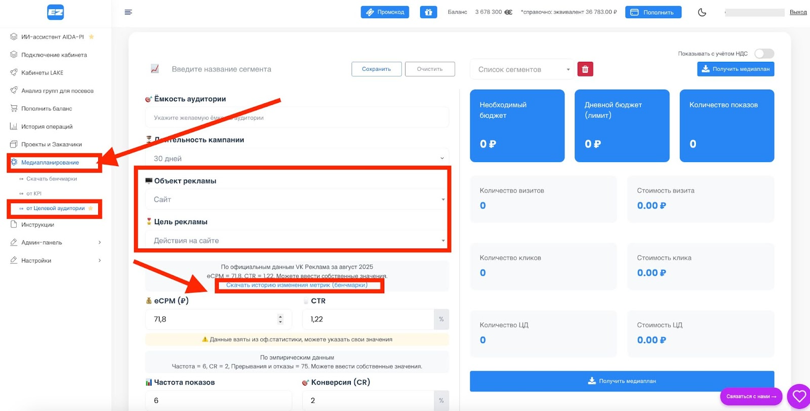 Калькулятор медиапланов. Это инструмент, который помогает заранее рассчитать перспективы проекта при продвижении в кабинете VK Реклама. Внутри два основных подхода к планированию: от KPI и от целевой аудитории Подробнее о возможностях Калькулятора медиапланов читайте в статье Медиапланирование в Е2 для кабинетов VK Реклама