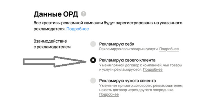 Выберите «Рекламирую своего клиента» (если это прямой рекламодатель). В случае, если кабинет открыт на посредника, выбрать «Рекламирую чужого клиента»
