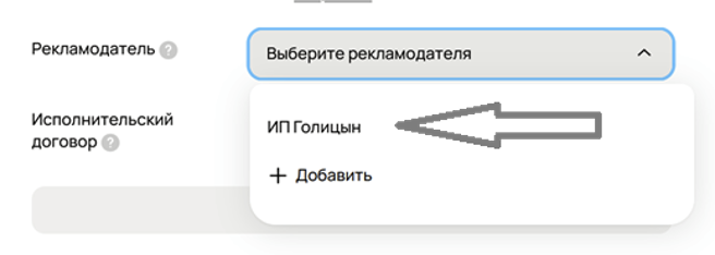 В поле «Рекламодатель» уже внесен ваш клиент. Выберите его: