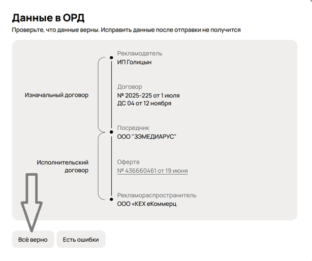 При создании кампании обязательно выбирайте данные вашего рекламодателя — это позволяет избежать ошибок с юридической информацией, данные для маркировки подтягиваются автоматически.