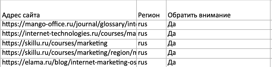 После группы «Обратите внимание» в таблице идут остальные сайты, отсортированные от более сильных к более слабым.