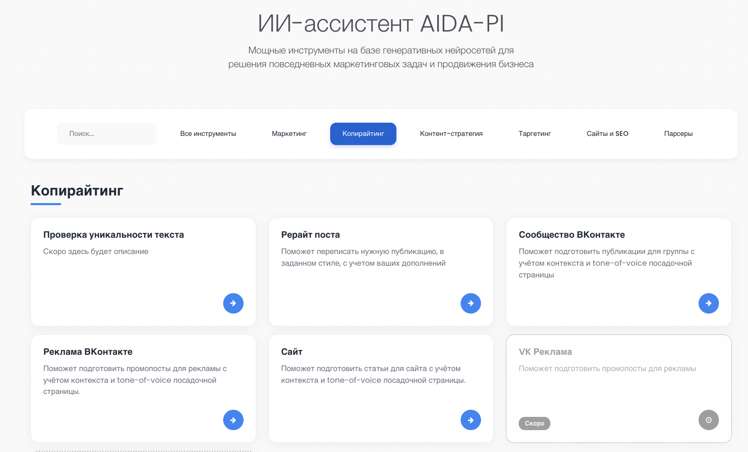 Поможет подготовить публикации для группы, промопосты для рекламы и статьи для сайта с учётом контекста и tone-of-voice посадочной страницы.