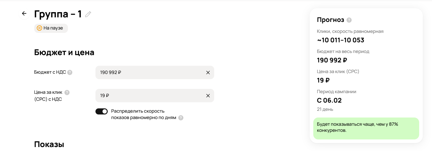 19 ₽ за клик — это слишком высокая ставка. Сразу агрессивный выкуп трафика с переплатой. Обратите внимание на подсказку от кабинета «Будет показываться чаще, чем у 87% конкурентов».