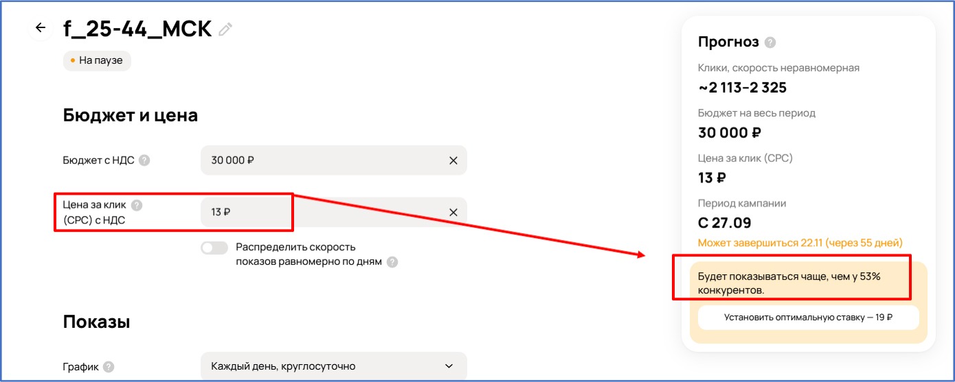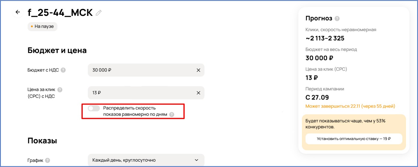 По нашим наблюдениям, при неизменной ставке около 80% дневного бюджета расходуется во второй половине дня — после 14:00 по московскому времени. Это важно учитывать при планировании кампаний и оценке динамики открутки.