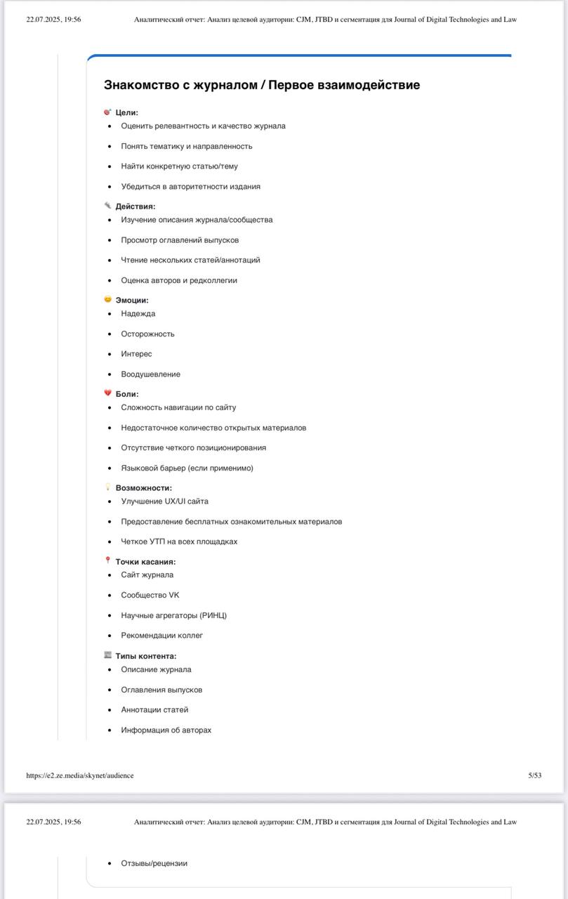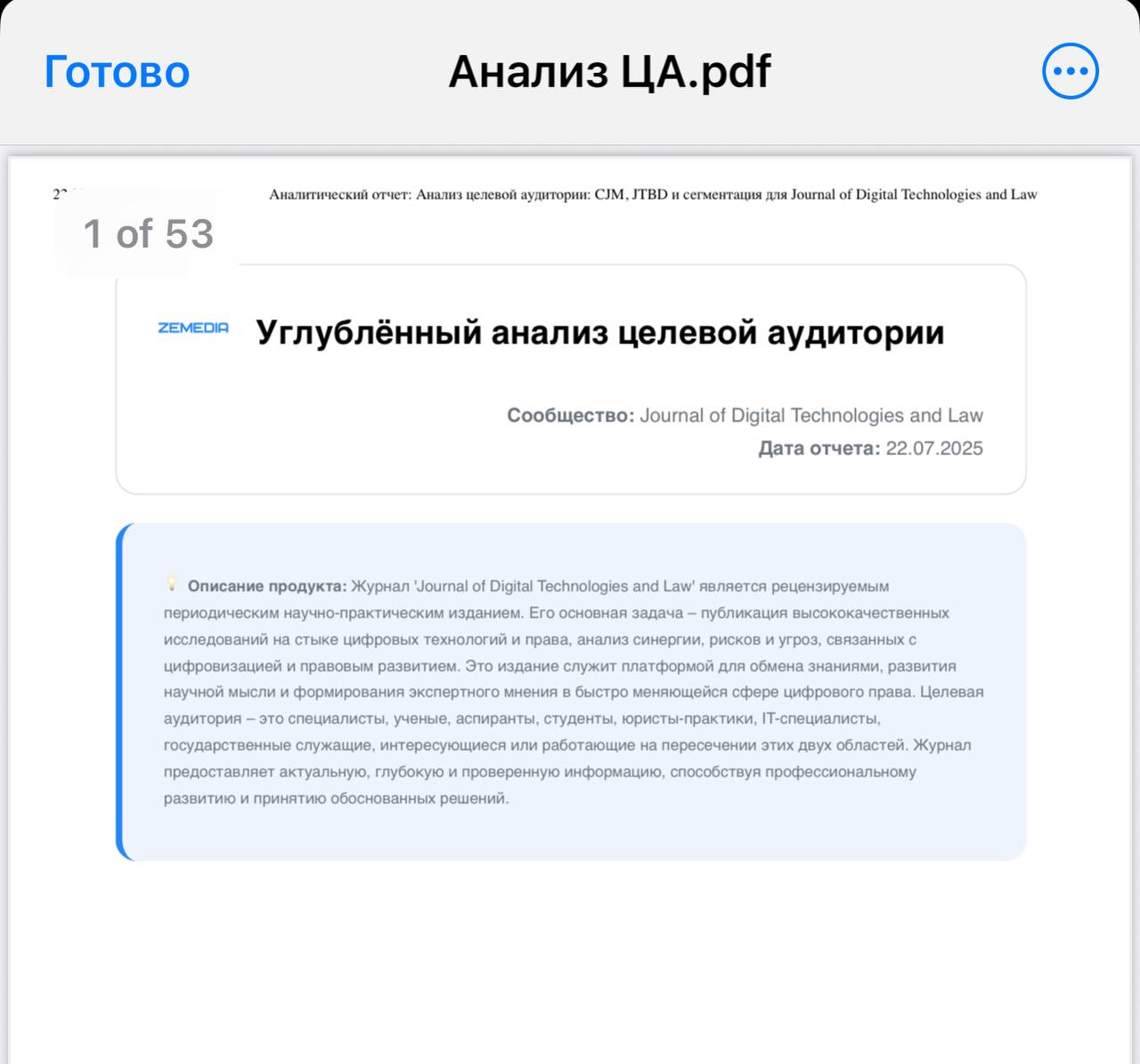 Анализ ЦА в исполнении нашего ИИ-ассистента — это 53 страницы рекомендаций в случае с юристами. Документ, который вы частично видите на скриншотах ниже, получен для Telegram-канала Journal of Digital Technologies and Law, для которого записывался подкаст. Анализ сделан в режиме "здесь и сейчас". Здесь малая часть, возможность подсмотреть, как выглядит содержимое.